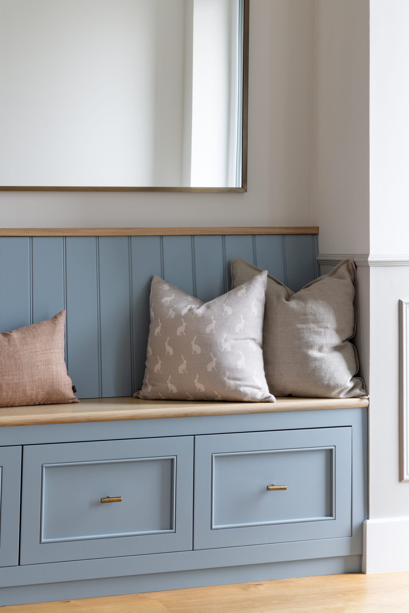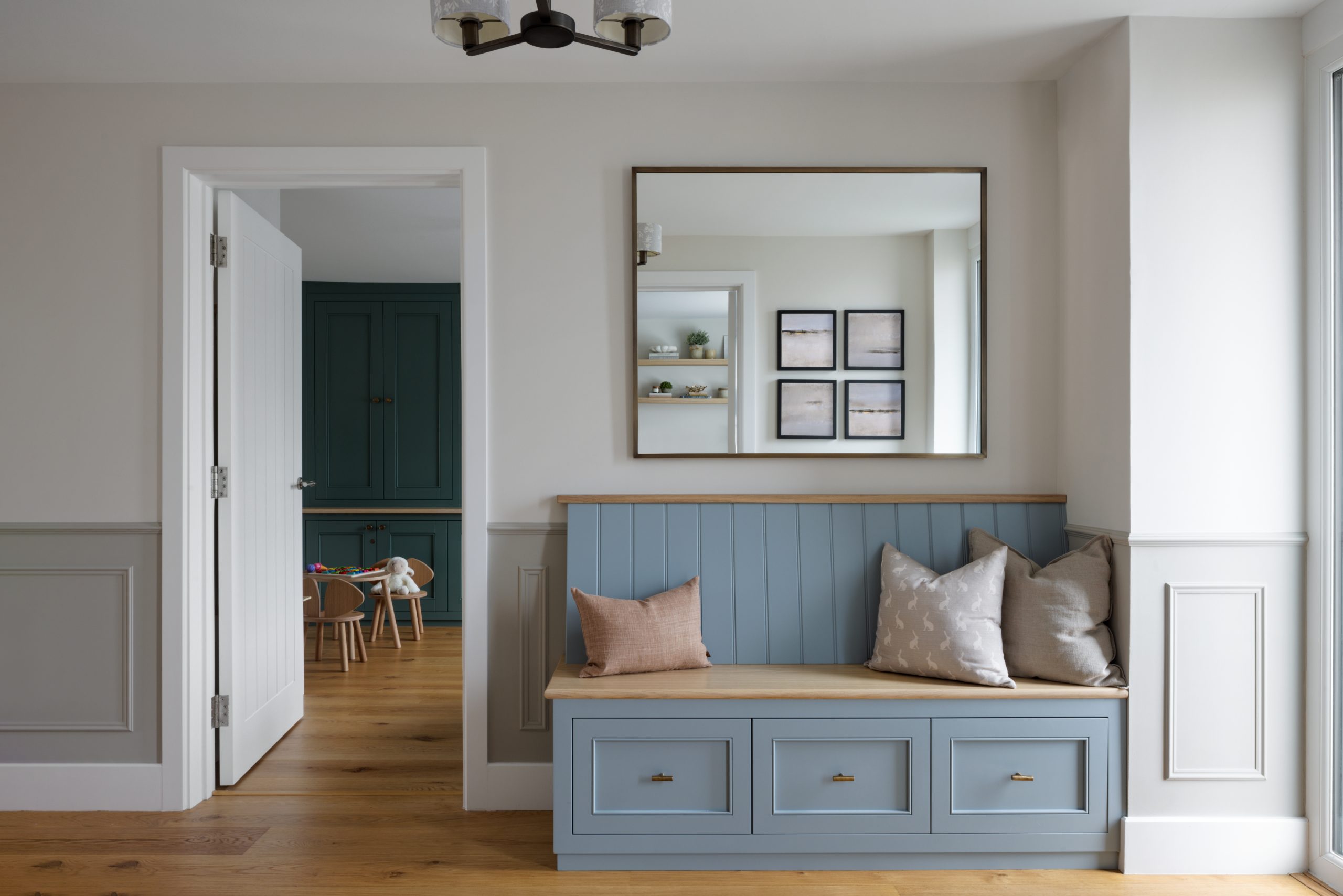This new build property set in the outskirts of Bristol was lacking character. The brief for our clients was to transform the property into a welcoming home; adding timeless features including panelling, built in joinery and bespoke furniture, ultimately injecting personality into their beautiful family home.