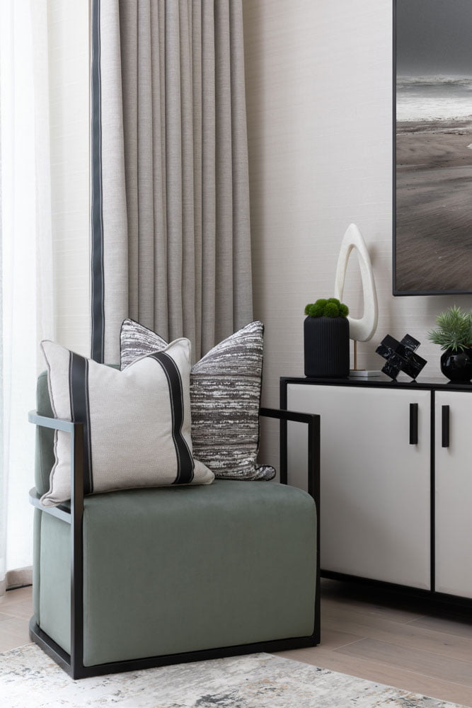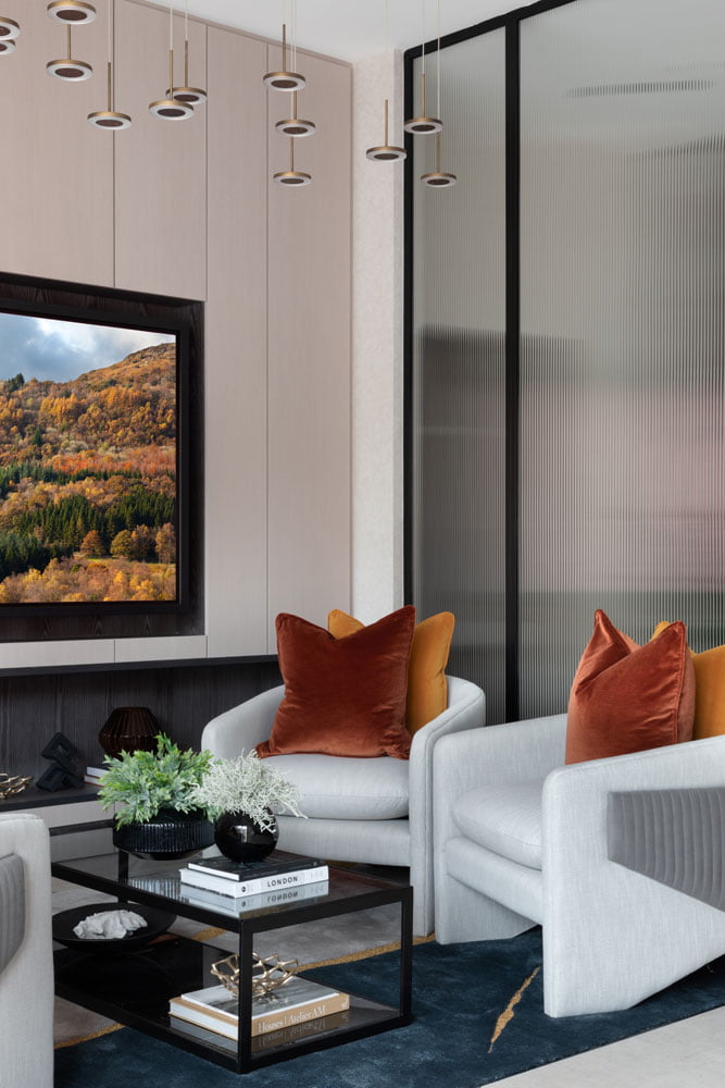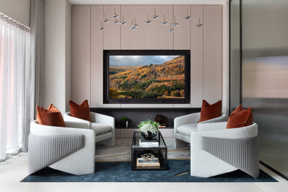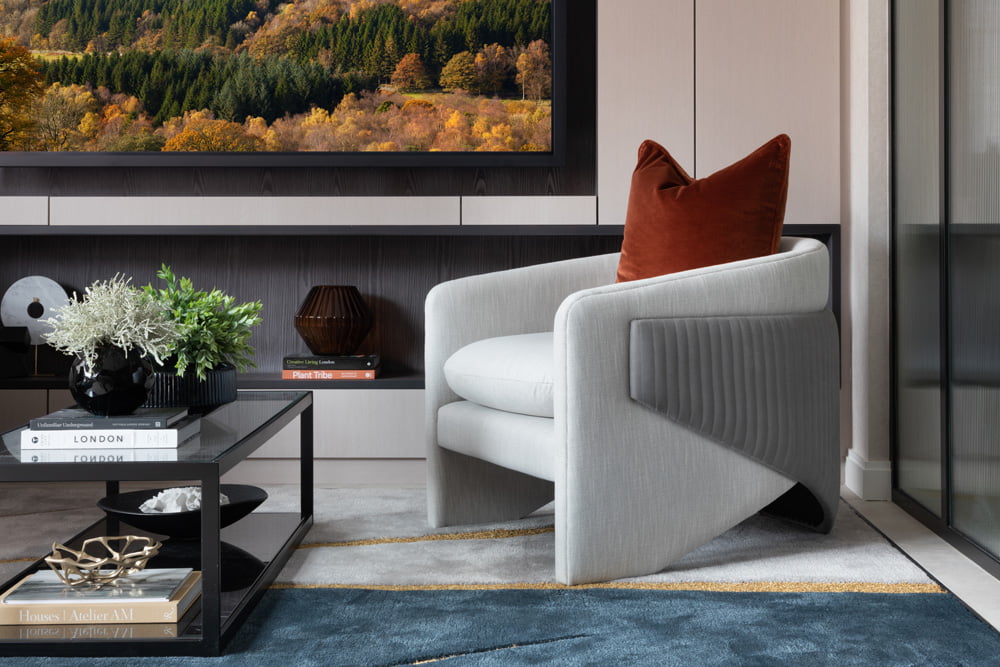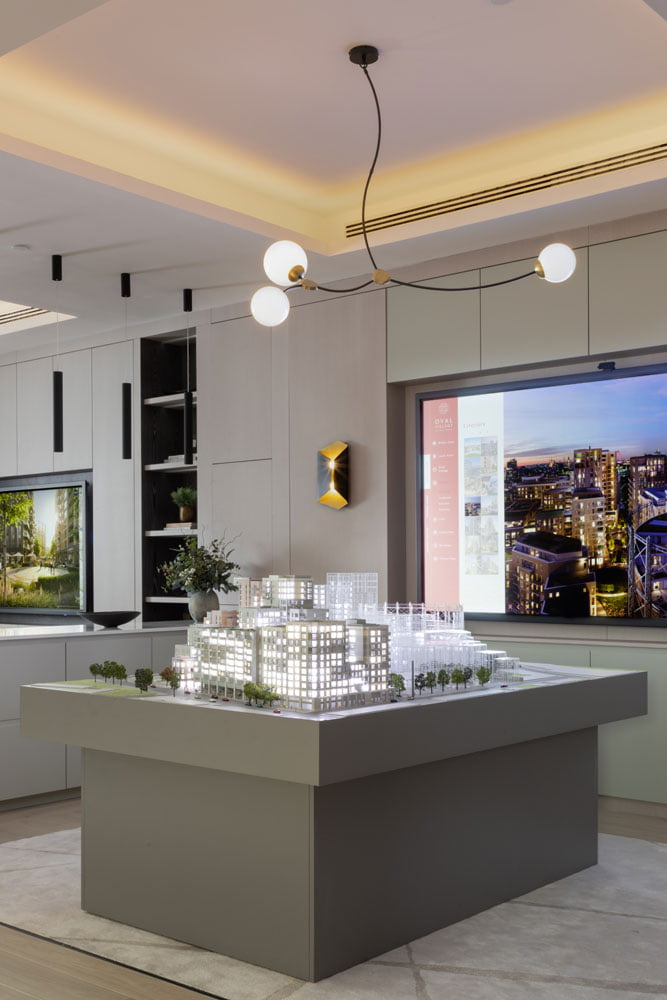 A full Base Build, joinery and FF&E package for one of the UKs top luxury developers. Including fully designed bespoke joinery and furniture along with lighting and base build finishes. The sales suite was designed in a contemporary palette of colours incorporating black accents with rich navy blue and gold hues.
